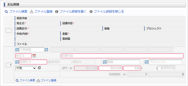 項目名 説明 予算期間 予算期間を選択します。 利用予算 利用する予算を選択します。 発生日 経費の発生日を入力します。 経費内容 経費の概要を入力します。 経費区分 経費区分(勘定科目と税区分の組み合わせ)を選択します。 (勘定科目) 選択した経費区分に紐づく勘定科目を表示します。 (税区分) 選択した経費区分に紐づく税区分を表示します。 組織 費用の計上組織を選択します。 プロジェクト 費用の計上プロジェクトを選択します。 外税/内税 経費が内税か外税かを選択します。選択内容により、入力項目が変化します。(再計算) 金額を再計算します。 (通貨) 請求書払情報(外貨支払)で選択した通貨が選択されています。 税込金額 税込金額を入力します。外税/内税項目で外税を選択した場合は、税抜金額 + 消費税額を表示します。税抜金額 税抜金額を入力します。外税/内税項目で内税を選択した場合は、税込金額 - 消費税額を表示します。消費税額 消費税額を入力します。 (消費税額(自動計算)) 税込金額、または税抜金額と税区分に紐づく税率を計算した金額を表示します。 源泉徴収額 源泉徴収額を入力します。請求書払情報(外貨支払, 予算連携)で選択した仕入先により、入力可否が変化します。ファイル 申請書にファイル検索が含まれている場合に利用できます。 コラム