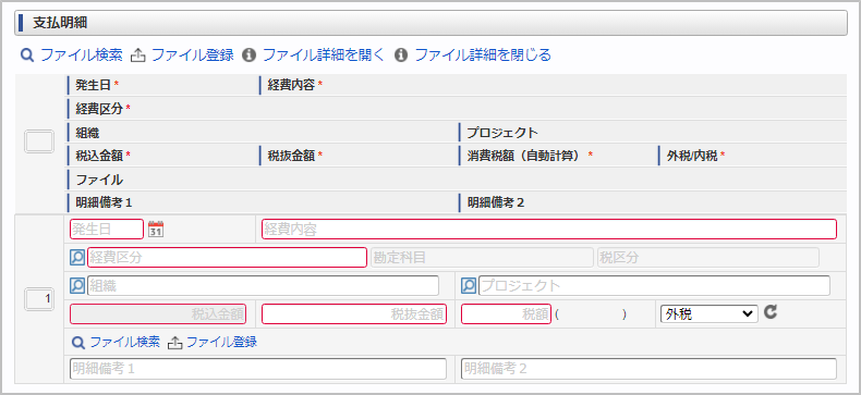 項目名 説明 発生日 経費の発生日を入力します。 経費内容 経費の概要を入力します。 経費区分 経費区分(勘定科目と税区分の組み合わせ)を選択します。 (勘定科目) 選択した経費区分に紐づく勘定科目を表示します。 (税区分) 選択した経費区分に紐づく税区分を表示します。 外税/内税 経費が内税か外税かを選択します。選択内容により、入力項目が変化します。(再計算) 金額を再計算します。 組織 費用の計上組織を選択します。 プロジェクト 費用の計上プロジェクトを選択します。 税込金額 税込金額を入力します。外税/内税項目で外税を選択した場合は、税抜金額 + 消費税額を表示します。税抜金額 税抜金額を入力します。外税/内税項目で内税を選択した場合は、税込金額 - 消費税額を表示します。消費税額 消費税額を入力します。 (消費税額(自動計算)) 税込金額、または税抜金額と税区分に紐づく税率を計算した金額を表示します。 ファイル 申請書にファイル検索が含まれている場合に利用できます。 明細備考1 明細備考を入力します。 明細備考2 明細備考を入力します。 コラム