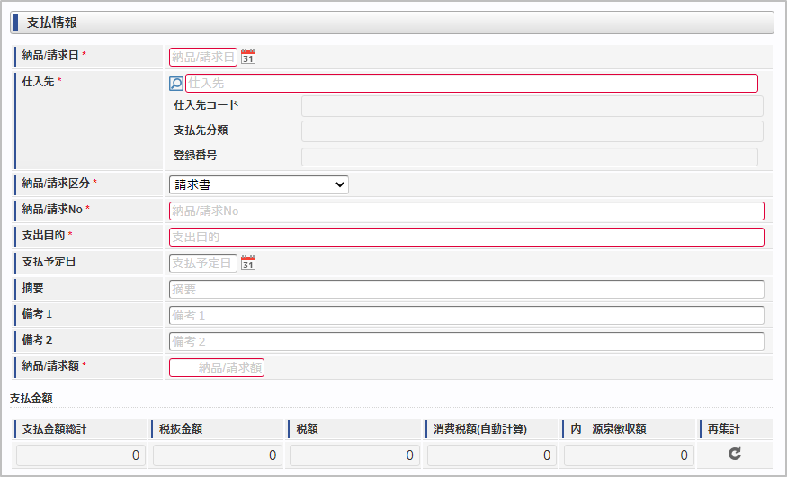 項目名 説明 納品/請求日 納品書/請求書に記載された納品/請求日を入力します。 仕入先 仕入先を選択します。 (仕入先コード) 選択された仕入先のコード値を表示します。 (支払先分類) 選択された仕入先の支払先分類を表示します。 (登録番号) 選択された仕入先の登録番号を表示します。 納品/請求区分 納品/請求を選択します。 納品/請求No 納品書/請求書に記載された納品/請求Noを入力します。「返還請求書」を選択した場合、仕訳作成時に反対仕訳のデータを作成します。支出目的 経費(支出)の目的や理由を入力します。 支払予定日 支払予定日を入力します。 摘要 摘要を入力します。 備考1 備考を入力します。 備考2 備考を入力します。 納品/請求額 納品書/請求書に記載された納品/請求額を入力します。 支払金額 支払金額の内訳を表示します。 (支払金額総計) 支払金額の総合計を表示します (内 源泉徴収額) 支払金額内の源泉徴収額を表示します (税抜金額) 支払金額の税抜額を表示します (消費税額) 支払金額内の消費税額を表示します (消費税額(自動計算)) 自動計算した消費税額を表示します 再集計 支払金額を再計算します。