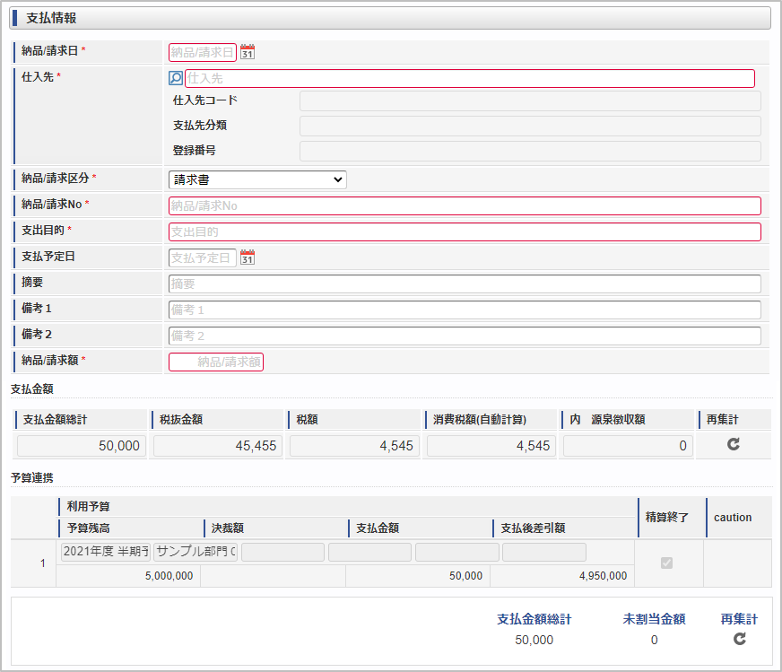 「納品/請求区分」に「返還請求書」を選択した場合、予算に関して返還処理を実施することはできません。支払金額分利用予算から差し引かれます。