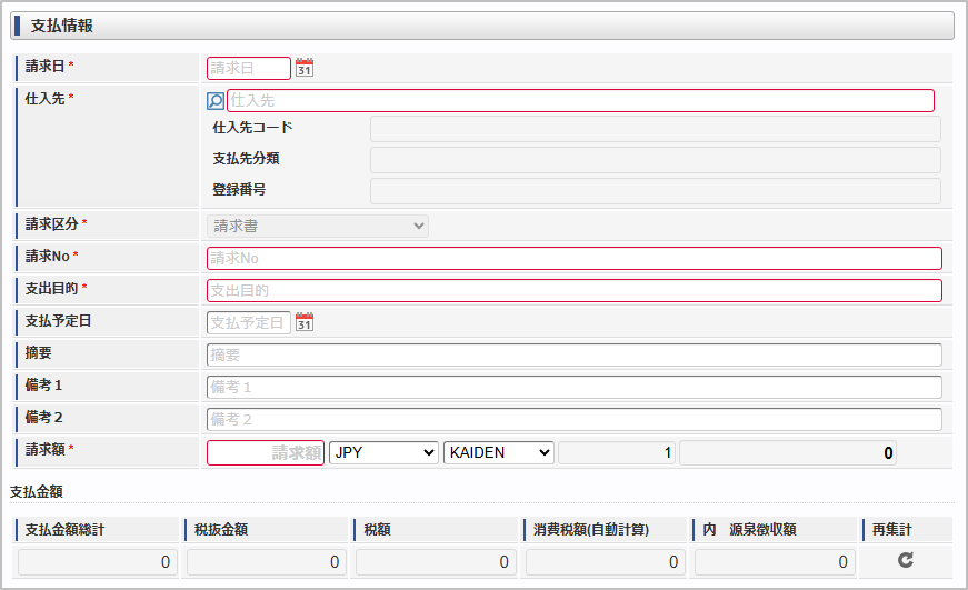 項目名 説明 請求日 請求書に記載された請求日を入力します。 仕入先 仕入先を選択します。 (仕入先コード) 選択された仕入先のコード値を表示します。 (支払先分類) 選択された仕入先の支払先分類を表示します。 (登録番号) 選択された仕入先の登録番号を表示します。 請求区分 「請求書」が選択されています。 請求No 請求書に記載された納品/請求Noを入力します。 支出目的 経費(支出)の目的や理由を入力します。 支払予定日 支払予定日を入力します。 摘要 摘要を入力します。 備考1 備考を入力します。 備考2 備考を入力します。 請求額 請求書に記載された請求額を入力します。 (通貨) 通貨を選択します。 (通貨換算コード) 通貨換算コードを選択します。 (換算レート) 換算レートを入力します。会社通貨と異なる通貨を選択した場合のみ、入力可能です。(換算額) 請求額×換算レートの計算結果を表示します。
