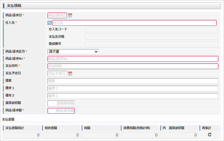 項目名 説明 納品/請求日 納品書/請求書に記載された納品/請求日を入力します。 仕入先 仕入先を選択します。 (仕入先コード) 選択された仕入先のコード値を表示します。 (支払先分類) 選択された仕入先の支払先分類を表示します。 (登録番号) 選択された仕入先の登録番号を表示します。 納品/請求区分 納品/請求を選択します。 納品/請求No 納品書/請求書に記載された納品/請求Noを入力します。「返還請求書」を選択した場合、仕訳作成時に反対仕訳のデータを作成します。支出目的 経費(支出)の目的や理由を入力します。 支払予定日 支払予定日を入力します。 摘要 摘要を入力します。 備考1 備考を入力します。 備考2 備考を入力します。 源泉徴収額 源泉徴収額を入力します。仕入先により、入力可否が変化します。納品/請求額 納品書/請求書に記載された納品/請求額を入力します。 支払金額 支払金額の内訳を表示します。 (支払金額総計) 支払金額の総合計を表示します (内 源泉徴収額) 支払金額内の源泉徴収額を表示します (税抜金額) 支払金額の税抜額を表示します (消費税額) 支払金額内の消費税額を表示します (消費税額(自動計算)) 自動計算した消費税額を表示します 再集計 支払金額を再計算します。 コラム