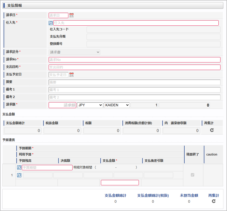 予算期間 予算期間を選択します。 明細対象期間 予算明細の期間を表示します。 利用予算 利用する予算を選択します。 予算残高 利用予算の予算残高を表示します。 決裁額 利用予算の事前申請額を表示します。 支払金額 選択した予算の税処理区分が「税込」の場合、支払金額総計の範囲内で予算として割当てる金額を入力します。選択した予算の税処理区分が「税抜」の場合、支払金額総計(税抜)の範囲内で予算として割当てる金額を入力します。支払後差引額 予算残高 ― 支払金額の計算結果を表示します。または、決裁額 ― 支払金額の計算結果を表示します。精算終了 チェックを付けると予算の精算を終了することができます。 coution 支払後差引額が警告・上限設定を超過する際、アイコンを表示します。 支払金額総計 明細ガジェットの合計金額を表示します。 支払金額総計(税抜) 明細ガジェットの合計金額(税抜)を表示します。 未割当金額 選択した予算の税処理区分が「税込」の場合、支払金額総計 ― 支払金額の計算結果を表示します。選択した予算の税処理区分が「税抜」の場合、支払金額総計(税抜) ― 支払金額の計算結果を表示します。再集計 明細ガジェットの金額を再集計し表示します。 コラム
