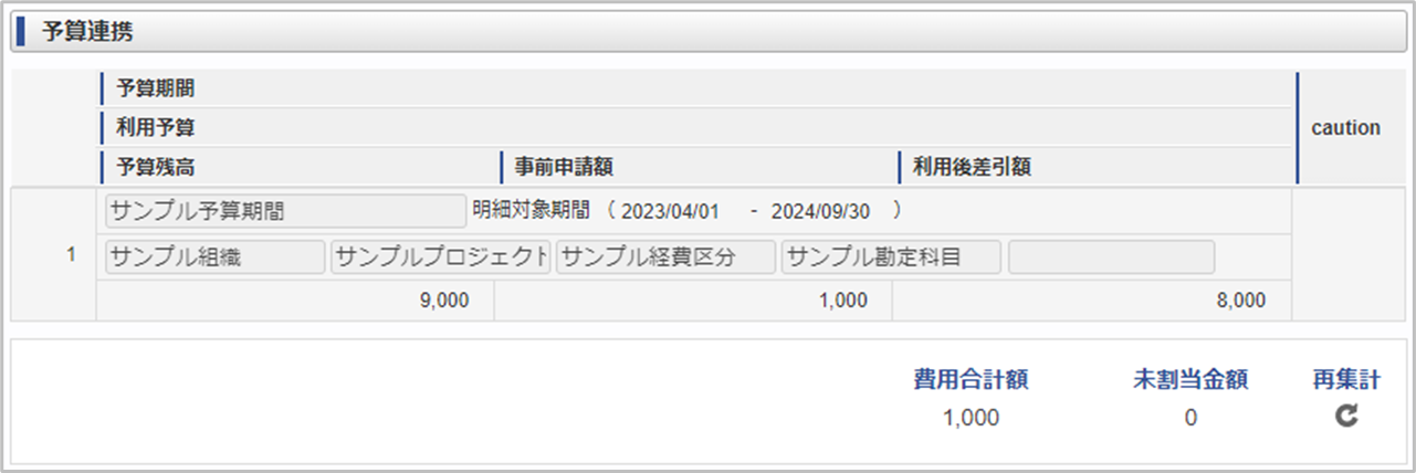 項目名 説明 予算期間 予算期間を表示します。 明細対象期間 引き当てられた予算明細の期間を表示します。 利用予算 利用する予算を表示します。 予算残高 利用予算の予算残高を表示します。 事前申請額 明細ガジェットの金額を表示します。 利用後差引額 予算残高 ― 事前申請額の計算結果を表示します。 coution 利用後差引額が警告・上限設定を超過する際、アイコンを表示します。 費用合計額 明細ガジェットの合計金額を表示します。 未割当金額 利用予算を割り当てていない明細ガジェットの合計金額を表示します。 再集計 明細ガジェットの予算を再集計し表示します。 コラム