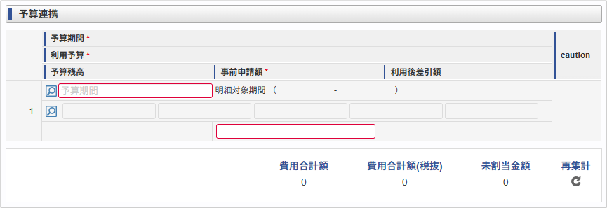 項目名 説明 予算期間 予算期間を選択します。 明細対象期間 予算明細の期間を表示します。 利用予算 利用する予算を選択します。 予算残高 利用予算の予算残高を表示します。 事前申請額 選択した予算の税処理区分が「税込」の場合、費用合計額の範囲内で予算として割当てる金額を入力します。選択した予算の税処理区分が「税抜」の場合、費用合計額(税抜)の範囲内で予算として割当てる金額を入力します。利用後差引額 予算残高 ― 事前申請額の計算結果を表示します。 coution 利用後差引額が警告・上限設定を超過する際、アイコンを表示します。 費用合計額 明細ガジェットの合計金額を表示します。 費用合計額(税抜) 明細ガジェットの合計金額(税抜)を表示します。 未割当金額 選択した予算の税処理区分が「税込」の場合、費用合計額 ― 事前申請額の計算結果を表示します。選択した予算の税処理区分が「税抜」の場合、費用合計額(税抜) ― 事前申請額の計算結果を表示します。再集計 明細ガジェットの金額を再集計し表示します。 コラム
