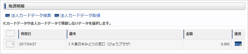 項目名 説明 利用日 利用日が表示されます。 備考 備考が表示されます。 金額 金額が表示されます。 連携 連携対象の機能のアイコンが表示されます。 コラム