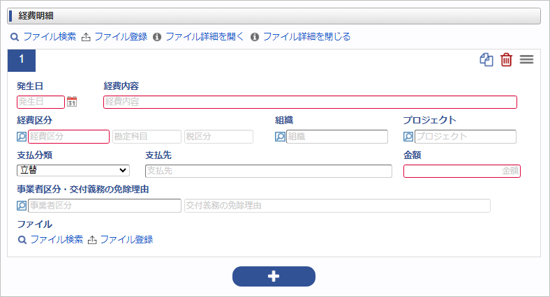 項目名 説明 発生日 経費の発生日を入力します。 経費内容 経費の概要を入力します。 経費区分 経費区分(勘定科目と税区分の組み合わせ)を選択します。 (勘定科目) 選択した経費区分に紐づく勘定科目を表示します。 (税区分) 選択した経費区分に紐づく税区分を表示します。 組織 費用の計上組織を選択します。 プロジェクト 費用の計上プロジェクトを選択します。 支払分類 支払分類を選択します。 支払先 支払先名称などを入力します。 金額 経費の金額を入力します。 事業者区分・交付義務の免除理由 申請書に事業者区分・交付義務の免除理由が含まれている場合に利用できます。インボイス制度の事業者区分、適格請求書交付義務の免除理由を選択します。ファイル 申請書にファイル検索が含まれている場合に利用できます。 コラム