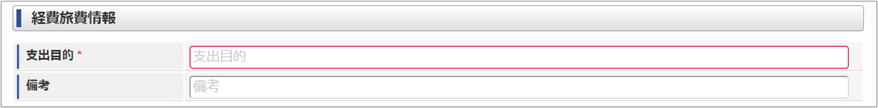 概要 経費や旅費に関する概要を入力するガジェットです。 PC用の画面 スマートフォン用の画面 項目 項目名 説明 支出目的 経費(支出)や旅費の目的や理由を入力します。 備考 備考を入力します。