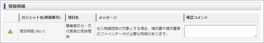 概要 申請書のアラートを表示するガジェットです。 また、アラートに対するコメントを入力できます。 PC用の画面 スマートフォン用の画面 項目 項目名 説明 ガジェット名(明細番号) アラートが発生しているガジェットを表示します。 かっこ内に明細番号を表示します。 項目名 アラートが発生している項目名を表示します。 メッセージ メッセージを表示します。 確認コメント アラートに対するコメントを入力してください。 コラム 次のアイコンが表示されている場合、確認コメントの入力が必須です。 次のアイコンが表示されている場合、確認コメントの入力は任意です。