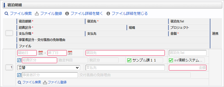 項目名 説明 宿泊期間 宿泊期間(開始日・終了日)を入力します。 宿泊先 宿泊先の名称などを入力します。 宿泊先Tel 宿泊先の連絡先などを入力します。 経費区分 経費区分(勘定科目と税区分の組み合わせ)を選択します。 (勘定科目) 選択した経費区分に紐づく勘定科目を表示します。 (税区分) 選択した経費区分に紐づく税区分を表示します。 組織 費用の計上組織を選択します。 プロジェクト 費用の計上プロジェクトを選択します。 支払分類 支払分類を選択します。 支払先 支払先名称などを入力します。 金額 宿泊金額(合計)を入力します。 連携 出張手配実績データ検索ガジェットなどを使用してデータを反映した場合、アイコンを表示します。 事業者区分・交付義務の免除理由 申請書に事業者区分・交付義務の免除理由が含まれている場合に利用できます。インボイス制度の事業者区分、適格請求書交付義務の免除理由を選択します。ファイル 申請書にファイル検索が含まれている場合に利用できます。 コラム