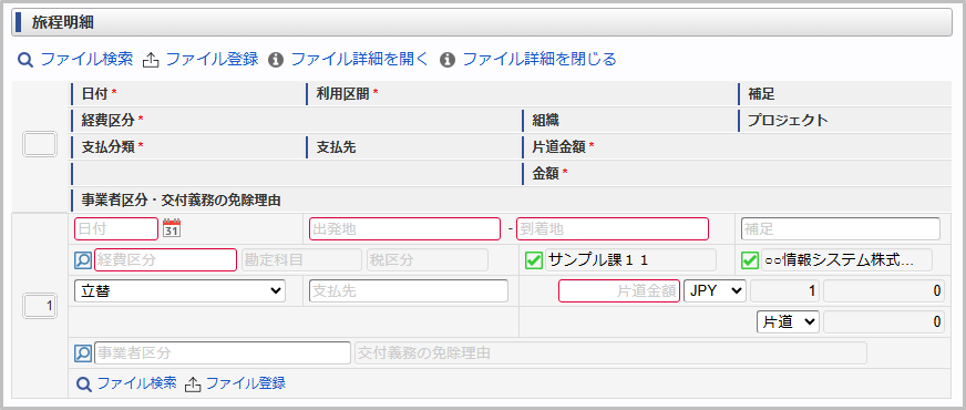 申請書にファイル検索が含まれている場合、ファイル検索・ファイル登録を利用することができます。使用方法は『intra-mart Accel Kaiden! 経費旅費 / ユーザ操作ガイド』-「リファレンス」-「各種操作」を参照してください。コラム