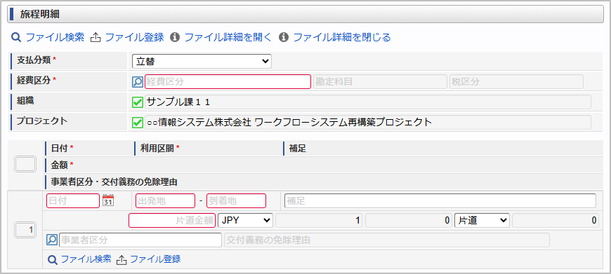 申請書にファイル検索が含まれている場合、ファイル検索・ファイル登録を利用することができます。使用方法は『intra-mart Accel Kaiden! 経費旅費 / ユーザ操作ガイド』-「リファレンス」-「各種操作」を参照してください。コラム