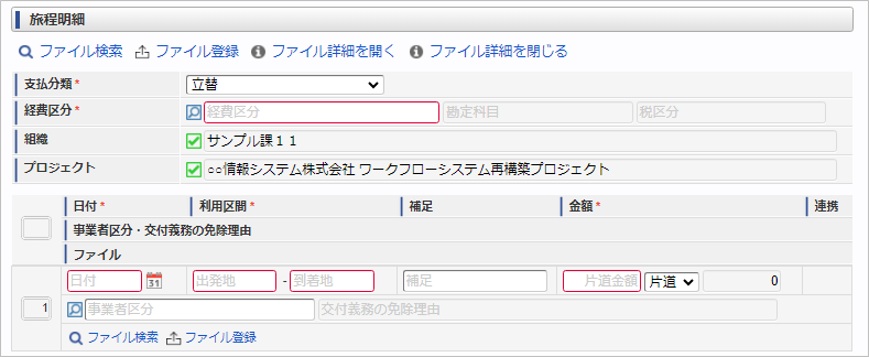 申請書にファイル検索が含まれている場合、ファイル検索・ファイル登録を利用することができます。使用方法は『intra-mart Accel Kaiden! 経費旅費 / ユーザ操作ガイド』-「リファレンス」-「各種操作」を参照してください。コラム