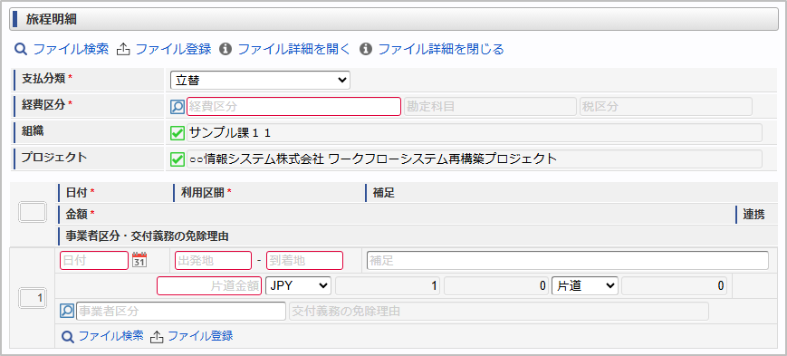 申請書にファイル検索が含まれている場合、ファイル検索・ファイル登録を利用することができます。使用方法は『intra-mart Accel Kaiden! 経費旅費 / ユーザ操作ガイド』-「リファレンス」-「各種操作」を参照してください。コラム