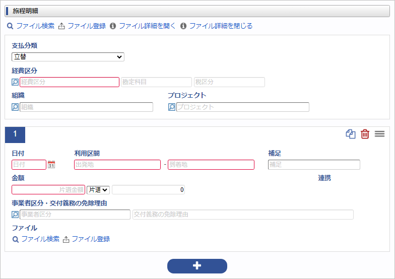 申請書にファイル検索が含まれている場合、ファイル検索・ファイル登録を利用することができます。使用方法は『intra-mart Accel Kaiden! 経費旅費 / ユーザ操作ガイド』-「リファレンス」-「各種操作」を参照してください。コラム