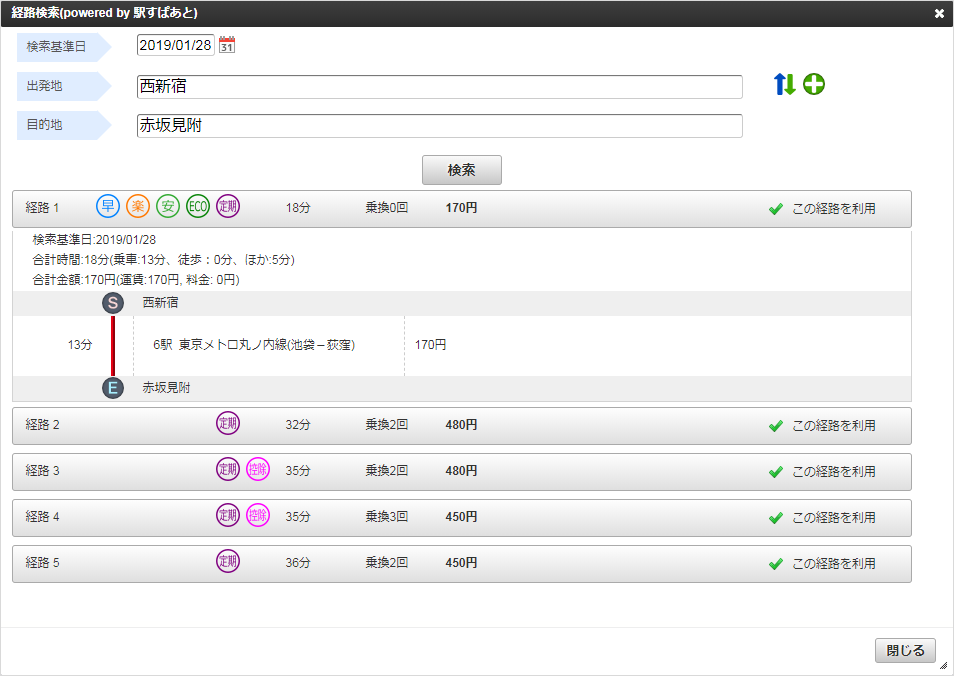 概要 駅すぱあと APIと連携して経路情報を検索し、ガジェットに反映するガジェットです。 PC用の画面 スマートフォン用の画面 「経路検索」ボタンをクリックした場合、検索画面が表示されます。 検索条件 項目名 説明 検索基準日 検索基準日を入力します。 出発地 出発地を入力します。 目的地 目的地を入力します。 表示項目 項目名 説明 この経路を利用/確定 クリックしたデータが反映先のガジェットに反映されます。 コラム ガジェットに反映したデータは一部項目を除いて編集できません。