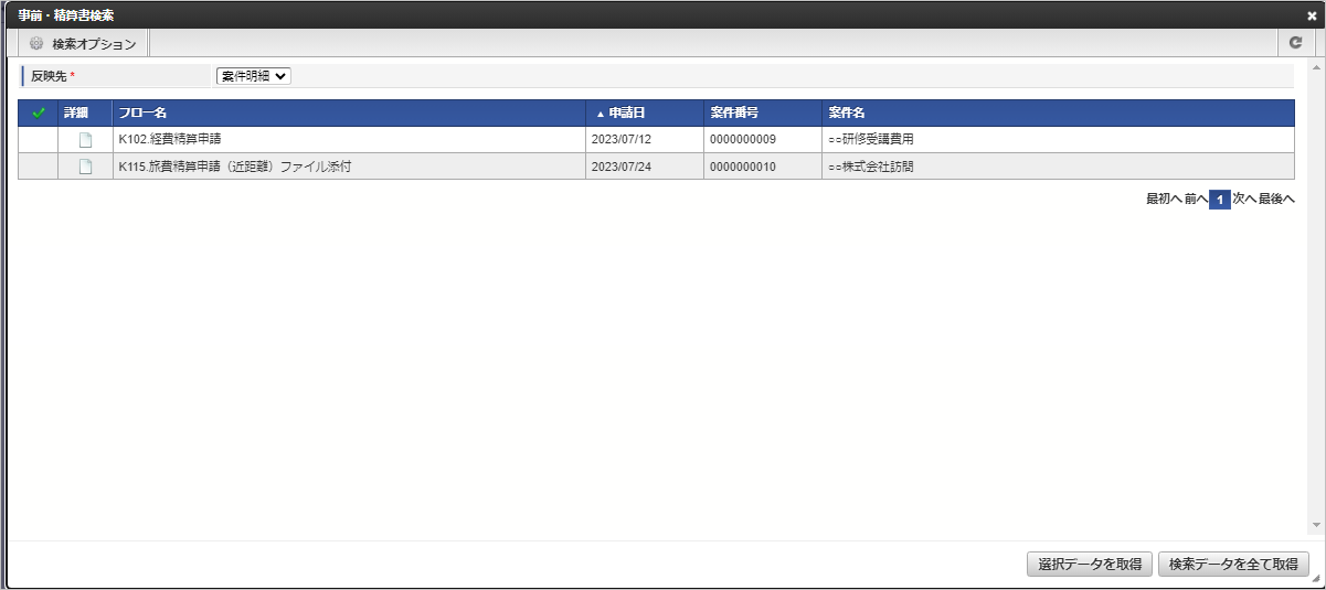 「事前・精算書検索」ボタンをクリックした場合、検索画面が表示されます。
