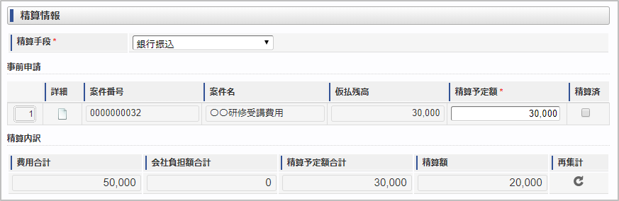 項目名 説明 精算手段 精算が必要な場合の精算手段を選択します。 詳細 関連づけた事前申請書を別画面で表示します。 案件番号 関連づけた事前申請書の案件番号を表示します。 案件名 関連づけた事前申請書の案件名を表示します。 仮払残高 関連づけた事前申請書の仮払残高を表示します。 精算予定額 仮払残高のうち、精算対象とする金額を入力します。 精算済 関連付けた事前申請書を精算済にする場合、チェックします。 精算内訳 精算金額の内訳を表示します。 (費用合計額) 経費明細などに入力された費用の合計を表示します。 (会社負担額額) 経費明細などに入力された費用のうち、「立替」でない金額の合計を表示します。 (精算予定額) 関連づけた事前申請書の精算予定額の合計を表示します。 (精算額) 費用合計額 - 会社負担額 - 精算予定額の計算結果を表示します。再集計 費用合計額・会社負担額・精算予定額・精算額を再計算します。 注意