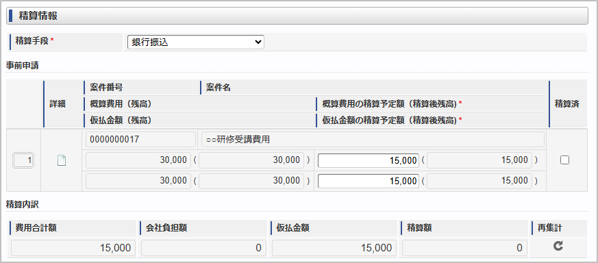 項目名 説明 精算手段 精算が必要な場合の精算手段を選択します。 詳細 関連づけた事前申請書を別画面で表示します。 案件番号 関連づけた事前申請書の案件番号を表示します。 案件名 関連づけた事前申請書の案件名を表示します。 概算費用(残高) 概算費用は、関連づけた事前申請書の概算費用を表示します。概算費用(残高)は、関連づけた事前申請書の概算費用残高を表示します。概算費用の精算予定額(精算後残高) 概算費用残高のうち、精算対象とする金額を入力します。概算費用の精算予定額(精算後残高)は、当精算申請書が承認された際の概算費用残高を表示します。仮払金額(残高) 仮払金額は、関連づけた事前申請書の仮払金額を表示します。仮払金額(残高)は、関連づけた事前申請書の概算費用残高を表示します。仮払金額の精算予定額(精算後残高) 仮払金額残高のうち、精算対象とする金額を入力します。仮払費用の精算予定額(精算後残高)は、当精算申請書が承認された際の仮払費用残高を表示します。精算済 関連付けた事前申請書を精算済にする場合、チェックします。 精算内訳 精算金額の内訳を表示します。 (費用合計額) 経費明細などに入力された費用の合計を表示します。 (会社負担額額) 経費明細などに入力された費用のうち、「立替」でない金額の合計を表示します。 (仮払金額) 関連づけた事前申請書の仮払金額の精算予定額の合計を表示します。 (精算額) 費用合計額 - 会社負担額 - 仮払金額の計算結果を表示します。再集計 費用合計額・会社負担額・仮払金額・精算額を再計算します。 注意