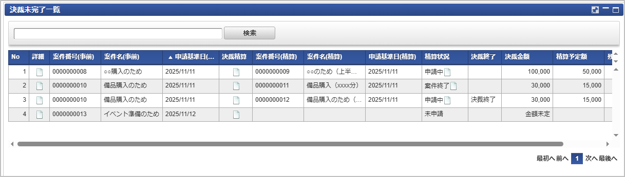 検索案件番号と案件名を対象にキーワード検索が行えます。 詳細アイコンをクリックすると決裁事前申請書の内容を確認できます。 案件番号(事前)決裁事前申請書の案件番号が表示されます。 案件名(事前)決裁事前申請書の案件名が表示されます。 申請基準日(事前)決裁事前申請書の申請基準日が表示されます。 決裁精算アイコンをクリックすると紐付く決裁精算申請書の申請画面に遷移します。複数のフローの決裁精算書を申請可能な場合、フロー選択画面に遷移します。 案件番号(精算)決裁精算申請書の案件番号が表示されます。 案件名(精算)決裁精算申請書の案件名が表示されます。 申請基準日(精算)決裁精算申請書の申請基準日が表示されます。 精算状況決裁精算申請書の作成状態などにより以下のように変化します。