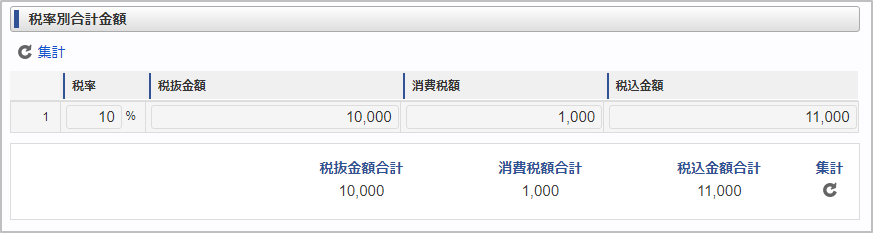 PC用の画面 スマートフォン用の画面 税率 税率を表示します。 税抜金額 税率ごとに集計された税抜金額を表示します。 消費税額 税率ごとに集計された消費税額を表示します。 税込金額 税率ごとに集計された税込金額を表示します。 税抜金額合計 集計された税抜金額の合計を表示します。 消費税額合計 集計された消費税額の合計を表示します。 税込金額合計 集計された税込金額の合計を表示します。 集計 申請書内の費用合計を集計します。 コラム 税率別合計金額ガジェットは、次のカテゴリのガジェットの金額を合計します。 旅程明細 経費明細 宿泊明細 請求書払明細