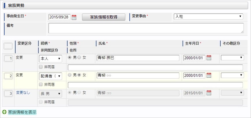 事由発生日家族異動の発生日を入力します。 家族情報を取得事由発生日時点の家族情報を取得します。 変更事由変更事由を選択します。 備考備考を入力します。 家族情報複数の家族情報を登録可能です。