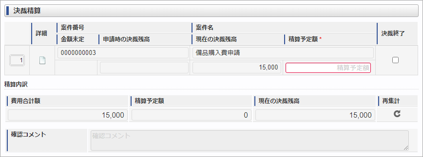 費用合計額請求書払明細などに入力された費用の合計を表示します。 精算予定額関連づけた決裁事前申請書の精算予定額の合計を表示します。 現在の決裁残高関連づけた決裁事前申請書の決裁残高の合計を画面表示時に計算してして表示します。関連づけた決裁事前申請書に金額未定の申請書が含まれる場合、空白を表示します。 確認コメント費用合計額が決裁残高の合計額を超えた場合、確認コメントを入力します。費用合計額が決裁残高より少ない場合、または関連づけた決裁事前申請書に金額未定の申請書が含まれる場合は入力不可となります。