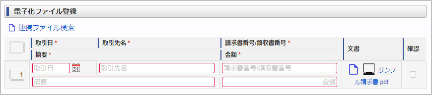 取引日添付した請求書/領収書の取引日を入力します。 取引先名添付した請求書/領収書の取引先名を入力します。 請求書番号/領収書番号添付した請求書/領収書の番号を入力します。 文書連携ファイル検索で選択した請求書/領収書を表示します。プレビューアイコンをクリックすると、連携されたファイルをプレビュー表示できます。PC操作の場合のみ、ファイル名をクリックすると、連携されたファイルをダウンロードできます。 確認処理時の入力項目です。申請内容と添付されたファイル(請求書/領収書)、原本を確認して問題ない場合、確認担当者がチェックします。 摘要摘要を入力します。 金額添付した請求書/領収書の取引金額を入力します。コラム