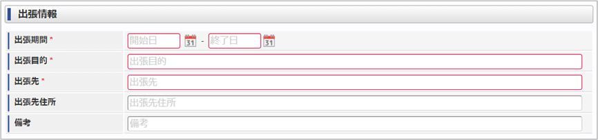 PC用の画面 スマートフォン用の画面 出張期間 出張の出発日と帰着日をそれぞれ入力します。 出張目的/出張先/出張先住所/備考 それぞれ必要な情報を入力します。