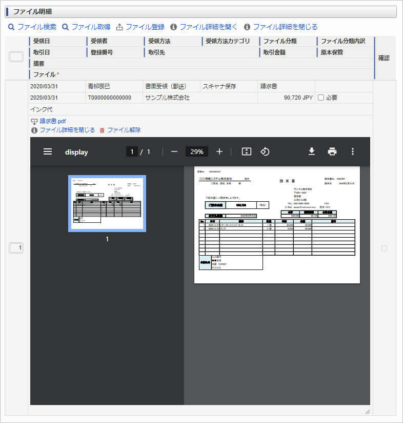 受領日添付したファイルの受領日を表示します。 受領者添付したファイルの受領者を表示します。 受領方法添付したファイルの受領方法を表示します。 受領方法カテゴリ添付したファイルの受領方法カテゴリを表示します。 ファイル分類添付したファイルのファイル分類を表示します。 ファイル分類内訳添付したファイルのファイル分類内訳を表示します。 取引日添付したファイルの取引日を表示します。 登録番号添付したファイルの登録番号を表示します。 取引先添付したファイルの取引先を表示します。 取引金額添付したファイルの取引金額を表示します。 原本保管原本を保管する必要のあるファイルの場合チェックします。 摘要添付したファイルの摘要を表示します。 ファイルファイル検索で選択したファイルを表示します。ファイル名をクリックするとファイルをダウンロードできます。ファイル詳細を閉じるのリンクをクリックすると、ファイルのプレビューを非表示にすることができます。ファイル詳細を開くのリンクをクリックすると、ファイルのプレビューを表示することができます。ファイルが画像ファイル、PDF以外の場合、プレビューは表示されません。ファイル解除のリンクをクリックすると、添付したファイルの連携を解除することができます。 確認処理時の入力項目です。申請内容と連携されたファイル、原本を確認して問題ない場合、確認担当者がチェックします。コラム