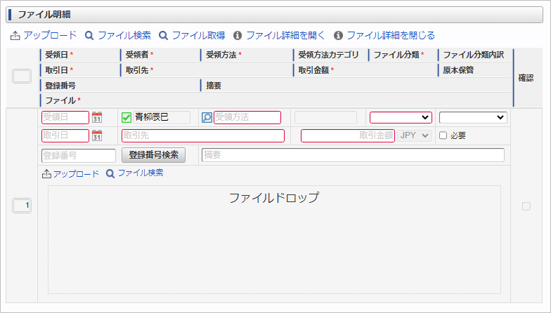 受領日添付したファイルの受領日を入力します。 受領者添付したファイルの受領者を入力します。 受領方法添付したファイルの受領方法を選択します。 受領方法カテゴリ添付したファイルの受領方法カテゴリを表示します。 ファイル分類添付したファイルのファイル分類を選択します。 ファイル分類内訳添付したファイルのファイル分類内訳を選択します。 取引日添付したファイルの取引日を入力します。 取引先添付したファイルの取引先を入力します。 取引金額添付したファイルの取引金額を入力します。通貨は変更できません。 原本保管原本を保管する必要のあるファイルの場合チェックします。 登録番号添付したファイルの登録番号を入力します。 摘要添付したファイルの摘要を入力します。 ファイルアップロードのリンクをクリックすると、ファイルをアップロードします。アップロードしたファイル及びファイル検索で選択したファイルを表示します。ファイル名をクリックするとファイルをダウンロードできます。ファイル詳細を閉じるのリンクをクリックすると、ファイルのプレビューを非表示にすることができます。ファイル詳細を開くのリンクをクリックすると、ファイルのプレビューを表示することができます。ファイルが画像ファイル、PDF以外の場合、プレビューは表示されません。アップロードしたファイルの場合、ファイル削除のリンクをクリックすると、添付したファイルを削除します。ファイル検索から選択したファイルの場合、ファイル解除のリンクをクリックすると、添付したファイルの連携を解除することができます。 確認処理時の入力項目です。申請内容と連携されたファイル、原本を確認して問題ない場合、確認担当者がチェックします。コラム