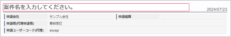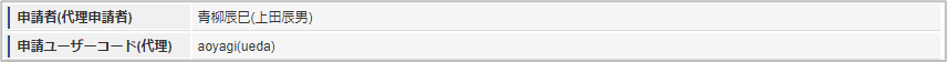 ガジェットのマスタデータ取得の基準日は、基本的に申請基準日です。一時保存後に申請基準日を変更した場合に変更後の申請基準日でマスタデータを取得します。 申請会社申請書を作成する会社です。所属会社が一つの場合には、その会社名が表示されます。 申請組織申請を実施した場合に、申請した組織が表示されます。申請画面にて入力中の場合や一時保存状態の場合は空欄です。 申請者(代理申請者)申請者を表示します。代理申請でない限りは現在ログイン中のユーザ名が表示されます。代理申請の場合のみ、代理元と代理先のユーザ名が表示されます。 申請ユーザーコード(代理)申請者のユーザコードを表示します。代理申請でない限りは現在ログイン中のユーザコードが表示されます。代理申請の場合のみ、代理元と代理先のユーザコードが表示されます。