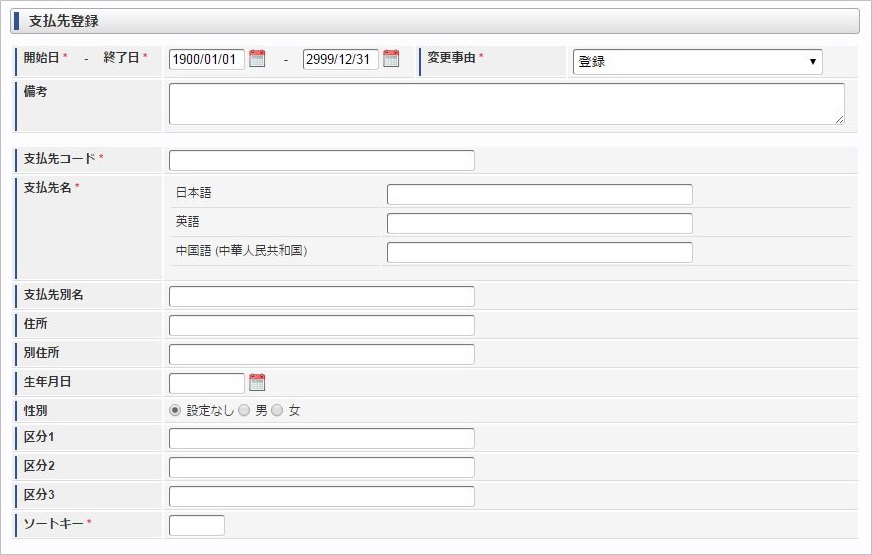 開始日 - 終了日支払先の有効期間を入力します。 変更事由変更事由を選択します。 備考備考を入力します。 支払先コード支払先コードを入力します。 支払先名支払先名を入力します。 支払先別名支払先別名を入力します。 住所住所を入力します。 別住所別住所を入力します。 生年月日生年月日を入力します。 性別性別を選択します。 区分1区分1を入力します。 区分2区分2を入力します。 区分3区分3を入力します。 ソートキー一覧検索時のソートキーを入力します。コラム