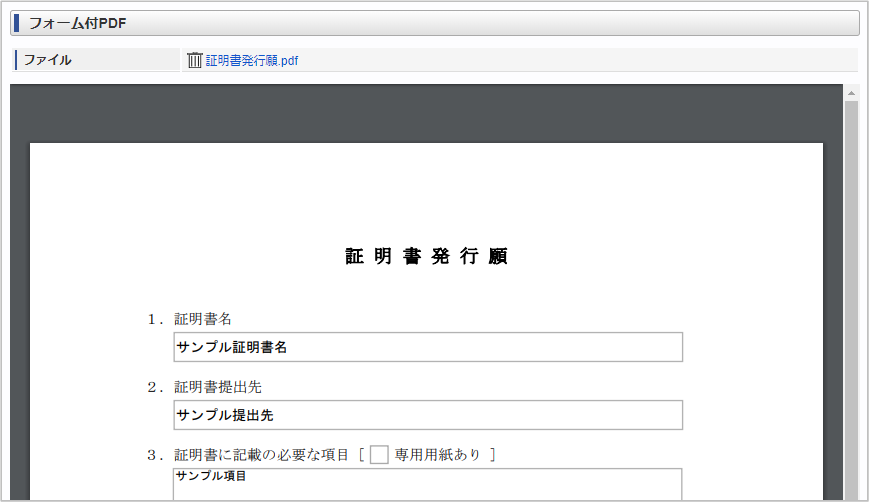 PC用の画面 PC用の画面(PDFファイル添付後) スマートフォン用の画面 スマートフォン用の画面(PDFファイル添付後) ファイル フォーム付きPDFを添付します。 PC用画面の添付方法はファイル添付を参照してください。 スマートフォン用画面の添付方法はファイル添付を参照してください。 PC用の場合 ファイル名をクリックすると添付したファイルを削除します。 スマートフォン用の場合 ファイル名をタップすることで添付したファイルのプレビューを表示します。 削除をタップすることで添付したファイルを削除します。