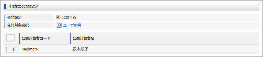 公開設定申請書を公開する場合にチェックします。 公開対象者選択ユーザ検索画面を表示し、公開対象者を選択します。 申請書公開範囲