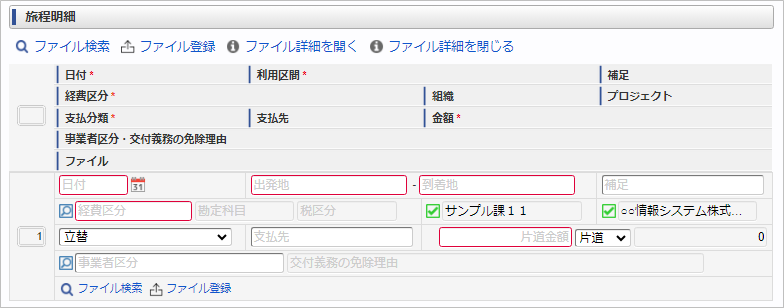 支払分類 意味 立替 「立替」は従業員が一時的な立替払いの場合に選択します。この金額は立替精算(仮払金がある場合の相殺)の対象です。立替以外(タクシー券、JR券など) 会社が支払う予定であったり、チケットなどを購入してある場合に選択します。この金額は立替精算の対象外です。 支払先支払先の名称などを入力します。 片道金額・金額片道金額を入力します。往復の場合には、「往復」にチェックを入れてください。金額が往復(2倍)で表示されます。 事業者区分・交付義務の免除理由申請書に事業者区分・交付義務の免除理由ガジェットが含まれている場合に利用できます。インボイス制度の事業者区分、適格請求書交付義務の免除理由を選択します。 ファイル申請書にファイル検索ガジェットが含まれている場合に利用できます。