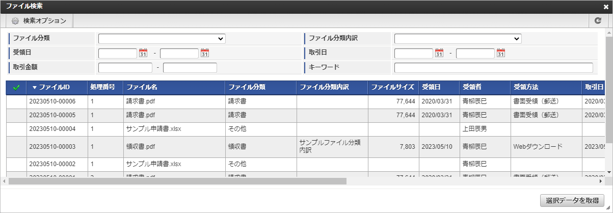 ファイル分類ファイル分類を入力します。 ファイル分類内訳ファイル分類内訳を入力します。 受領日受領日を入力します。 取引日取引日を入力します。 取引金額取引金額を入力します。 キーワード検索対象のキーワードを入力します。入力したキーワードが「ファイルID」、「ファイル名」、「受領者(ユーザコード・ユーザ名)」、「取引先名」、「摘要」、「登録番号」と部分一致する場合、検索対象となります。