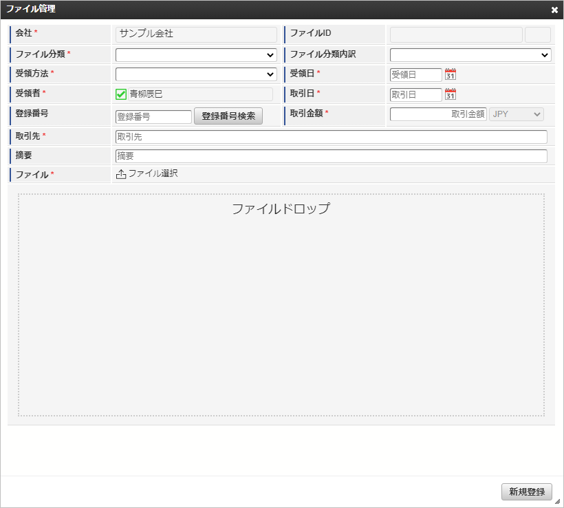 会社申請権限会社が選択されており、変更できません。 ファイル分類ファイル分類を選択します。 ファイル分類内訳ファイル分類内訳を選択します。 受領方法受領方法を選択します。 受領日受領日を入力します。 受領者申請権限者が選択されており、変更できません。 取引日取引日を入力します。 登録番号登録番号を入力します。「登録番号検索」をクリックすると、登録番号を検索できます。 取引金額取引金額を入力します。通貨は会社通貨が選択されており、変更できません。 取引先取引先を入力します。 摘要摘要を入力します。 ファイル「ファイル選択」アイコンをクリックしてファイルをアップロードします。ファイル分類が「領収書」、「請求書」の場合、アップロード可能なファイルは画像ファイル、PDFファイルです。ファイルアップロード後はファイル名が表示され、クリックするとファイルのアップロードを解除します。画像ファイル、PDFファイルを複数アップロードすると、1個のPDFファイルに統合して登録します。画像ファイル、PDFファイル以外のファイルは1ファイルのみアップロード可能です。 ファイルドロップPC操作の場合のみ、ファイルをドラッグアンドドロップしてファイルをアップロードします。ファイルアップロード後はファイルのプレビュー画面が表示されます。画像ファイル、PDFファイル以外のファイルの場合、プレビュー画面は表示されません。コラム