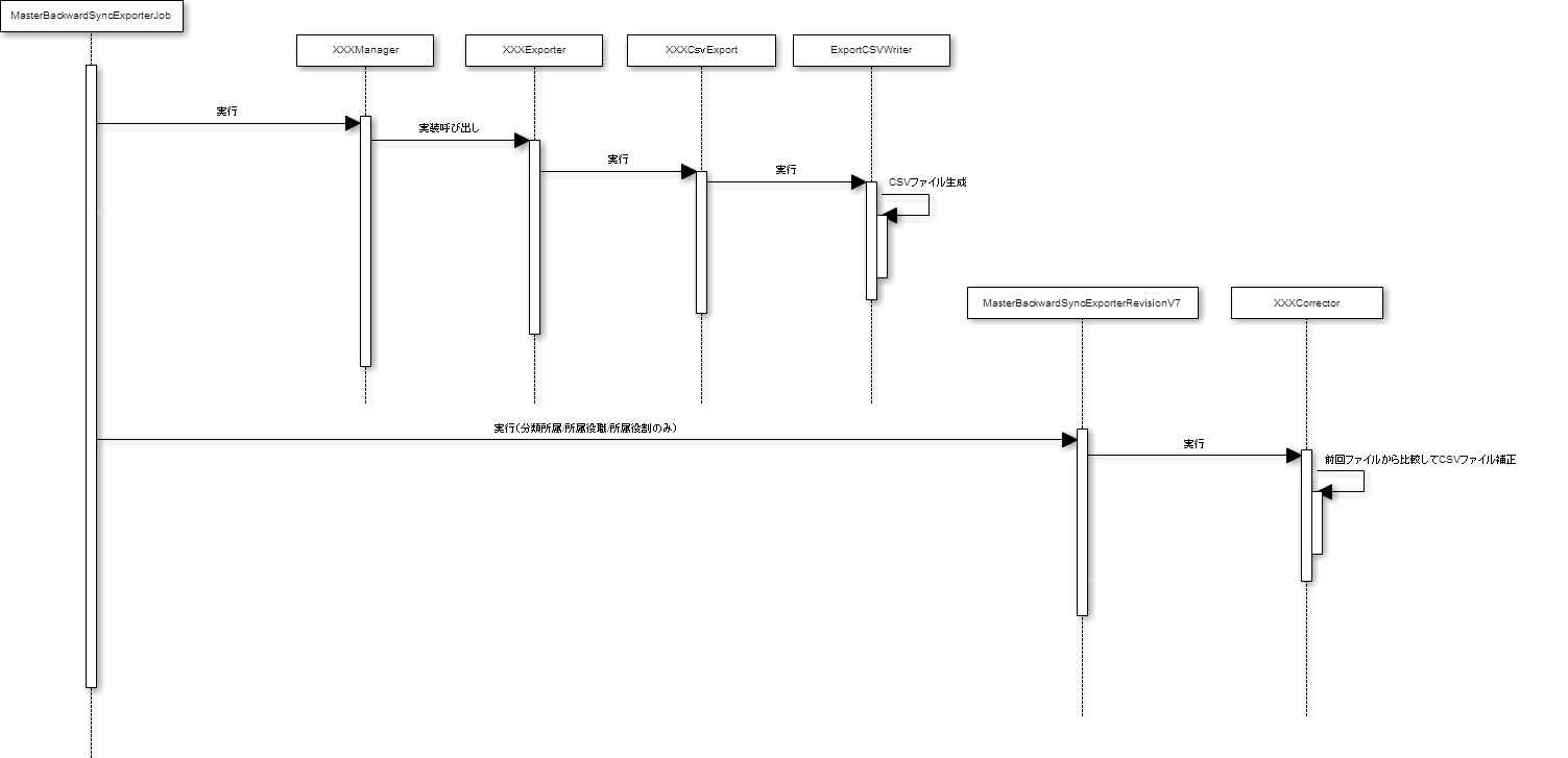 IM共通マスタから物理削除されたデータを保管するために前回のエクスポート情報と比較するプログラムです。jp.co.intra_mart.system.master_backward_sync.job_scheduler.MasterBackwardSyncExporterRevisionV7 jp.co.intra_mart.system.master_backward_sync.job_scheduler.UserCorrector jp.co.intra_mart.system.master_backward_sync.job_scheduler.UserCategoryCorrector jp.co.intra_mart.system.master_backward_sync.job_scheduler.CompanyCorrector jp.co.intra_mart.system.master_backward_sync.job_scheduler.PublicGroupCorrector jp.co.intra_mart.system.master_backward_sync.job_scheduler.PublicGroupCategoryCorrector