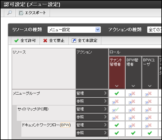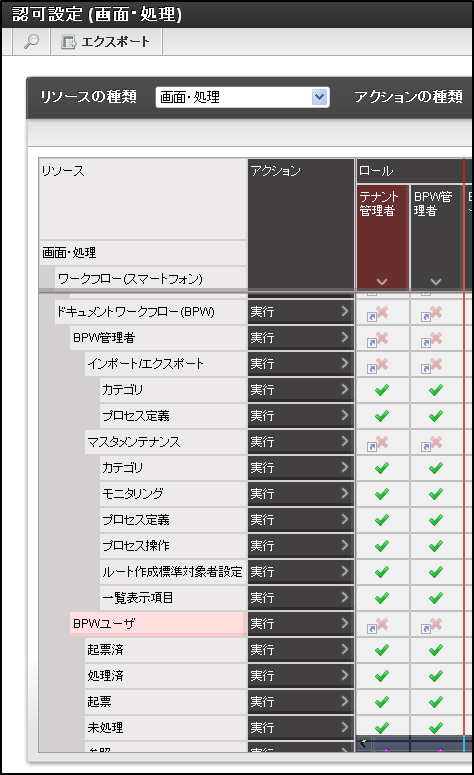 「ドキュメントワークフロー(BPW)」メニューグループの認可