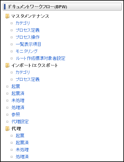 メニューは「ドキュメントワークフロー(BPW)」メニューグループに登録されています。デフォルトではサイトマップより各画面にアクセスできます。