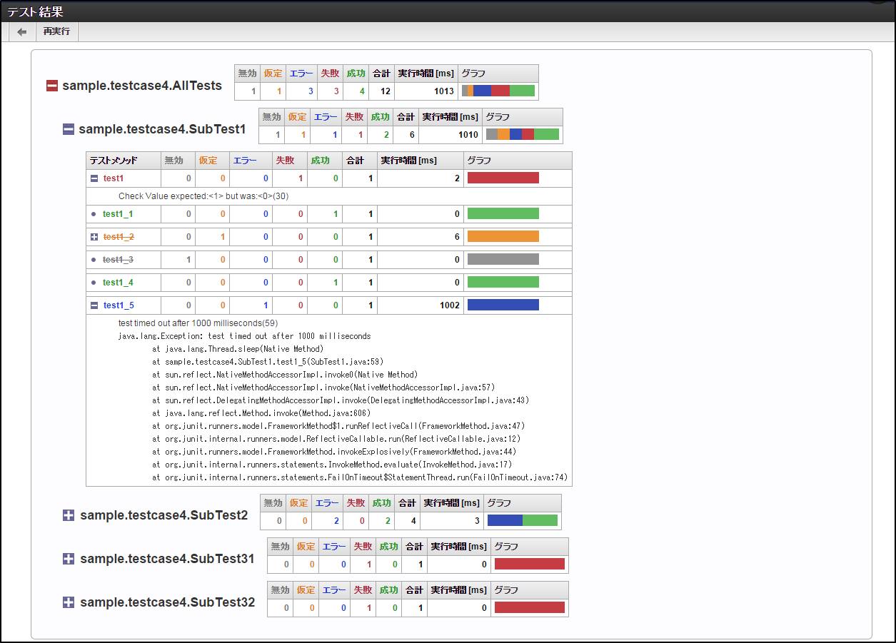 項目 説明 テストメソッド 実行したテストメソッド名です。テストメソッドで事前検証に失敗、評価に失敗、またはエラーが発生した場合は、テストメソッドがリンクとなります。リンクをクリックすることで、詳細な評価内容を確認できます。無効 無効となっているテストメソッドの数です。テストメソッドに対する値は、テストメソッドが無効となっている場合に1となります。JUnit4.xの仕様に基づいて作成されたテストケースの場合のみ表示されます。仮定 前提条件の評価に失敗した数です。テストメソッドに対する値は、テストメソッドで、事前検証が失敗した場合に1となります。JUnit4.xの仕様に基づいて作成されたテストケースの場合のみ表示されます。エラー テスト中にエラーが発生した数です。 失敗 テスト中に評価関数において、評価に失敗した数です。テストメソッドに対する値は、テストメソッドで評価関数が1つでも失敗した場合に1となります。成功 テスト中に評価関数において、評価に成功した数です。テストメソッドに対する値は、テストメソッド内ですべての評価関数が成功した場合に1となります。合計 テストメソッドの合計です。テストメソッドに対する値は、必ず1になります。実行時間 テストの実行時間です。単位はミリ秒です。 グラフ テスト結果を色覚的に棒グラフで表現しています。