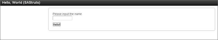 入力画面(index.jsp)を作成します。プロジェクトの src/main/webapp の下に /WEB-INF/view/sample/sa/hello という階層でフォルダを作成し、作成したフォルダ配下に「 index.jsp 」という名前でファイルを作成し、以下のソースを実装します。<%@page pageEncoding="UTF-8"%> <%@ taglib prefix="imui" uri="http://www.intra-mart.co.jp/taglib/imui"%> <%@ taglib prefix="s" uri="http://sastruts.seasar.org" %> <%@ taglib prefix="f" uri="http://sastruts.seasar.org/functions" %> <!-- HEADタグ --> <imui:head> <title>Hello, World</title> <script type="text/javascript"> $(function() { $('#button').click(function() { $('#helloForm').submit(); }); }); </script> </imui:head> <!-- 画面上に表示されるタイトル --> <div class="imui-title"> <h1>Hello, World (SAStruts)</h1> </div> <!-- 入力画面 --> <div class="imui-form-container-narrow"> <p> <label for="name">Please input the name. </label> </p> <!-- 入力フォームの設定 actionに結果表示画面へのパスを入力(Helloアクションのoutputメソッドを呼び出す) --> <s:form action="/sample/hello/output/" styleId="helloForm"> <div> <!-- テキストボックス --> <imui:textbox type="text" value='' id="name" name="name" size="10" /> </div> <!-- submitボタン --> <imui:button name="button" value="Hello!!" class="mt-10" id="button"></imui:button> </s:form> </div>注意