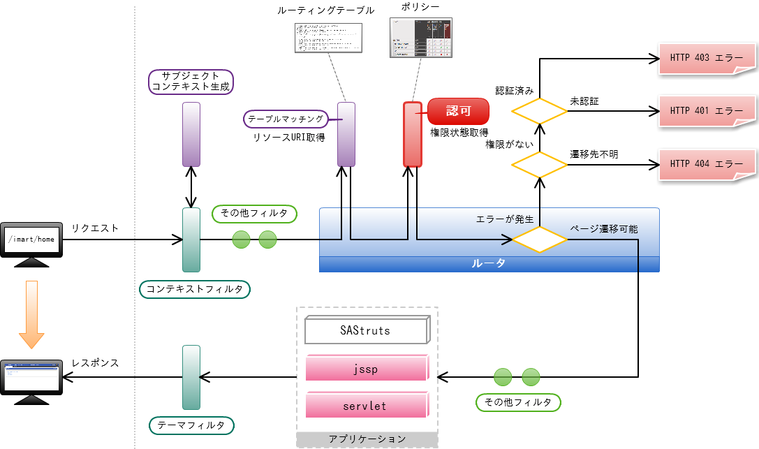 ルータの設定により画面へのアクセスが可能になりました。しかし、ルーティングテーブルで welcome-all マッパーを使用すると認可処理が省略されるため、誰でも画面を表示できます。実際にシステムを運用する際は、アクセス権限を設定して特定のユーザのみに画面を表示させ、アクセスの制限をかける場合がほとんどです。この章では、 intra-mart Accel Platform で用意されている認可機能を利用して、用意した画面を特定のユーザにのみ表示させる手順を説明します。