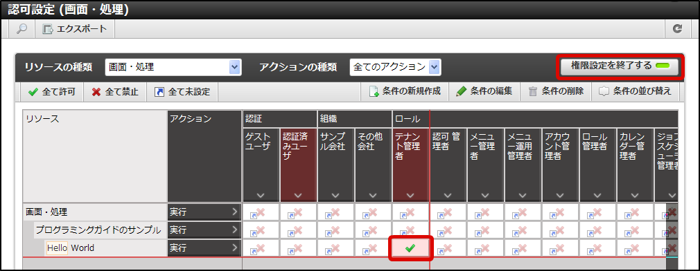 「権限設定を開始する」ボタンをクリックします。(クリック後、下図の赤枠のように表示されます)「Hello World」 の行と 「テナント管理者」 の列が交わるセルをクリックして、緑色のチェックに変更します。