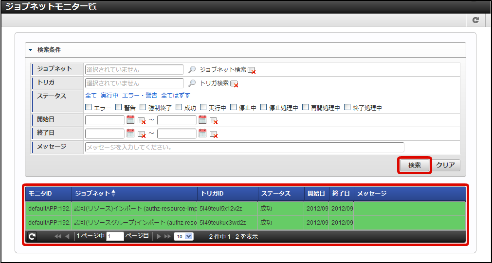 「ジョブネット一覧」 から 「テナントマスタ」-「インポート」-「認可(リソース)インポート」 を選択します。同じ操作を行い、ジョブネットを更新します。「サイトマップ」→「テナント管理」→「ジョブ管理」→「ジョブネットモニタ」の順にクリックします。一覧に 「認可(リソースグループ)インポート」 「認可(リソース)インポート」 の2行が表示され、 「成功」 になっていることを確認します。