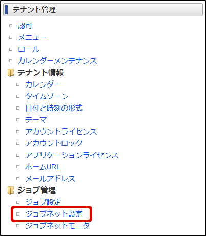 authz-resource タグの id 属性には任意の ID を指定できます。uri 属性にはルーティングテーブルで指定した authz タグの uri 属性と同じ値を指定します。parent-group タグの id 属性には、先ほど作成した authz-resource-group の id 属性と同じ値を指定します。resource-description タグにはリソースの説明を指定できます。 タグは省略可能です。実際の開発時は、認可管理者に対して登録したリソースがどの画面・処理・データを表しているか明示するために、説明を指定することをお勧めします。作成した<authz-resource-group.xml>と<authz-resource.xml>のファイルを、パブリックストレージのルート直下に配置します。テナント管理者で intra-mart Accel Platform にログインします。http://<HOST>:<PORT>/<CONTEXT_PATH>/login「サイトマップ」→「テナント管理」→「ジョブ管理」→「ジョブネット設定」の順にクリックします。