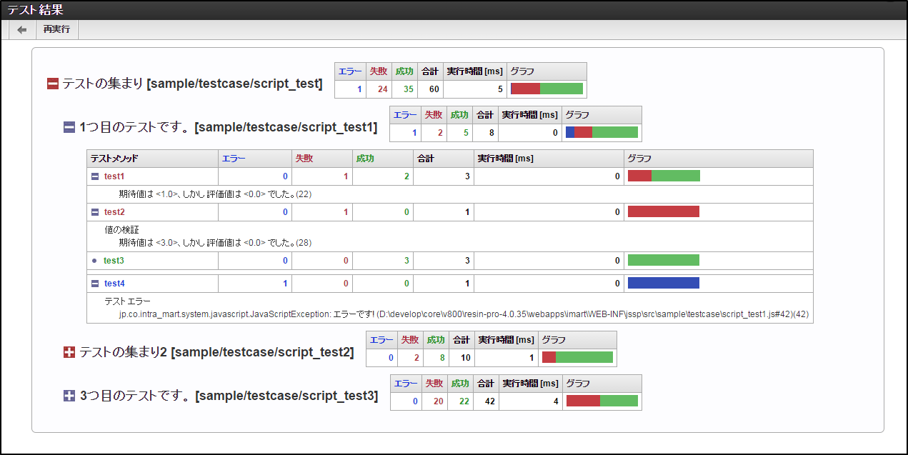 テストスィートは、複数のテストケースをまとめて実行できます。テストスィートの作成には、defineTestSuite 関数を定義します。defineTestSuite 関数内でJsTestSuiteオブジェクトを作成し、グループ化したいテストケースおよびテストスィートファイルを追加します。function defineTestSuite() { // JsTestSuiteオブジェクトの作成 // JsTestSuiteオブジェクトの第一引数は名称です。 let suite = new JsTestSuite("テストの集まり"); // テストケースまたはテストスィートファイルを追加します。 // addTest関数の第一引数は名称です。 // addTest関数の第二引数はテストケースまたはテストスィートファイルのパス(フルパス)です。 suite.addTest("1つ目のテストです。","sample/testcase/test2"); suite.addTest("2つ目のテストです。","sample/testcase/test3"); suite.addTest("3つ目のテストです。","sample/testcase/test_suite2"); // テストスィートオブジェクトを返却します。 return suite; }