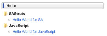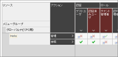 メニューアイテム名(日本語) Hello World for JavaScript URL helloworld/input また、メニューを閲覧できるようにするために作成した「Hello」グループに以下のように認可を設定します。本項では、Hello グループに対してゲストユーザと認証ユーザの参照を許可するように設定します。詳細については 認可 を参照してください。