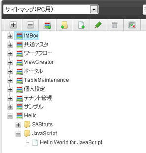ここでは、上記で作成したサンプルをサイトマップに登録して実際に実行します。Resin を起動し、テナント管理者で intra-mart Accel Platform にログインします。ログイン画面の URL は「 http://<HOST>:<PORT>/<CONTEXT_PATH>/login 」となります。その後、「メニュー設定」画面を表示し、メニューを以下のように設定します。ここで作成する新規アイテムの情報に以下の情報を入力します